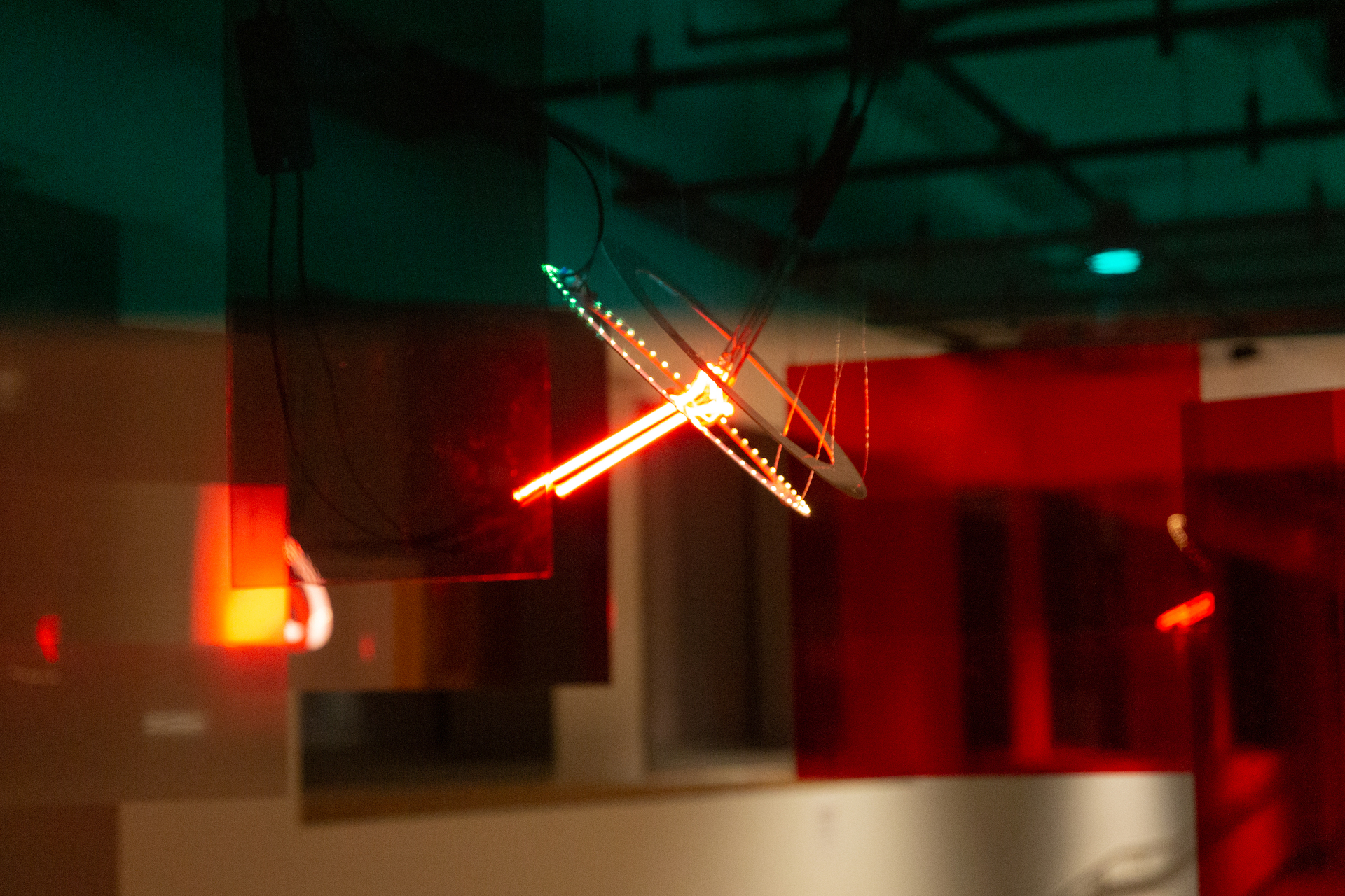 At the center, a light sculpture consists of two neon pieces and two PCBs (printed circuit boards) that are suspended at a height of 7'. Surrounding the light sculpture are 14 panels of acrylic sheets with various types of optical filters, suspended at heights ranging from 5'6" to 6'6". All suspended objects loosely occupy the width of the space, prompting people to walk around or pass underneath, much like the interaction between celestial objects. When doing so, because of the filters, the central light sculpture can be viewed in many different colors and textures. The light sculpture represents the artist's journey of crafting an identity, breathing on its own and reacting to every person passing by.